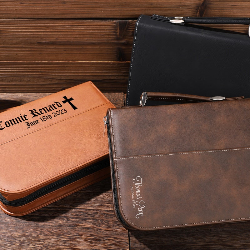 This beautiful laser engraved leather Bible cover makes for the perfect gift for many occasions! This case has a handle to make carrying a breeze, a metal zipper, a pen holder on the inside and a built in patch on the front for pens and other small items.